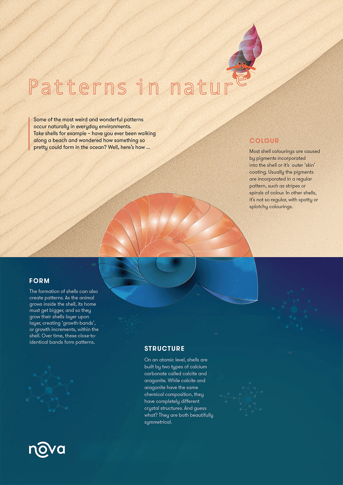 The formation of shells can also create patterns. As the animal grows inside the shell, its home must get bigger, and so they grow their shells layer upon layer, creating ‘growth-bands’, or growth increments, within the shell. Over time, these close-to- identical bands form patterns.