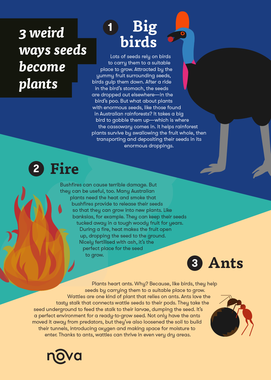 Lots of seeds rely on birds to carry them to a suitable place to grow. Attracted by the yummy fruit surrounding seeds, birds gulp them down. After a ride in the bird’s stomach, the seeds are dropped out elsewhere—in the bird’s poo. But what about plants with enormous seeds, like those found in Australian rainforests? It takes a big bird to gobble them up—which is where the cassowary comes in. It helps rainforest plants survive by swallowing the fruit whole, then transporting and depositing their seeds in its enormous droppings.