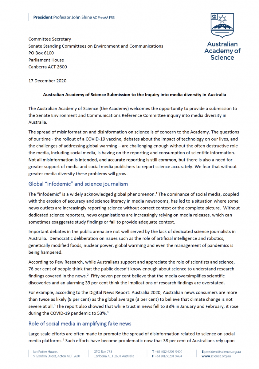 On 17 December 2020, the Academy provided a submission to the Senate Standing Committee on Environment and Communications in response to their inquiry into media diversity in Australia.