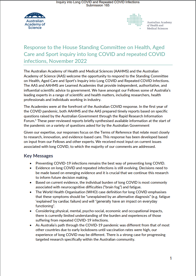 In November 2022, the Australian Academy of Science and the Australian Academy of Health and Medical Sciences made a joint submission to the Standing Committee on Health, Aged Care and Sport’s inquiry into long COVID and repeated COVID infections.