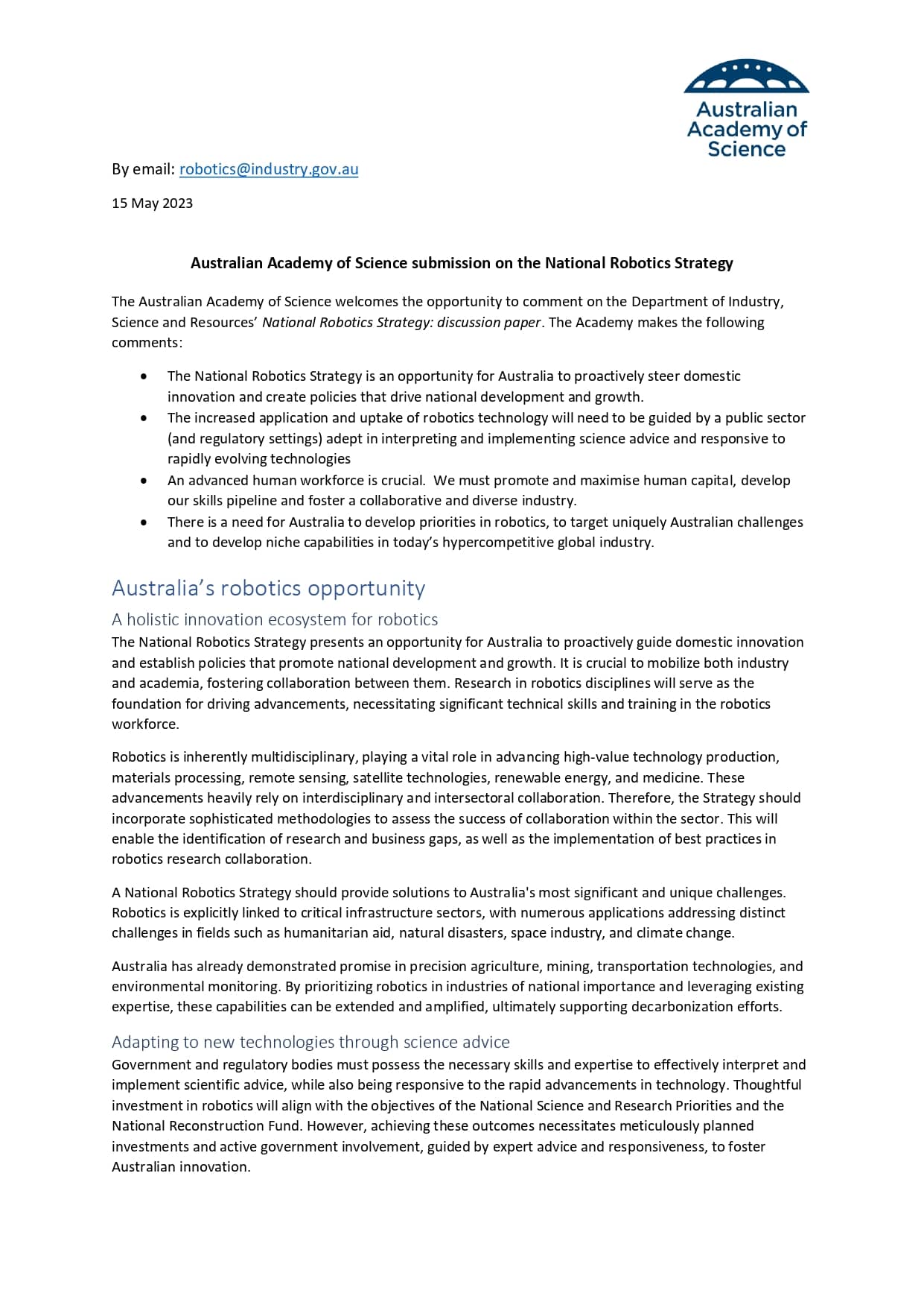 On 15 May 2023, the Australian Academy of Science made a submission to the Department of Industry, Science and Resources' 'National Robotics Strategy: discussion paper' consultation.